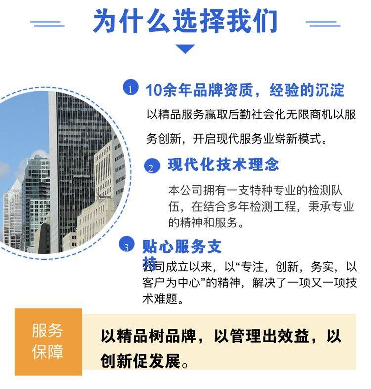 我公司是经工商审核批准,取得“建筑工程质量检测机构认定证书”的公司。公司注册资本为1000万元整,是国内资质的一家从事人防工程质量检测的第三方检测机构。我公司检测技术人员工作经验丰富,技术力量强。公司管理制度、检测规范、检测程序、检测流程健全,技术雄厚。检测实验室、检测设备齐全。公司以的仪器设备为依托,用科学规范的检测方法、客观公正的认真态度。